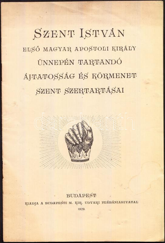 1929 Bp., Szent István első magyar apostoli király ünnepén tartandó áj... https://www.darabanth.com/de/234-Fernauktion/234.0/Andere-Sammelgebiete/Drucksachen~40003/1929-Bp-Szent-Istvan-elso-magyar-apostoli-kiraly-unnepen-tartando-ajtatossag-es-kormenet~II1070330