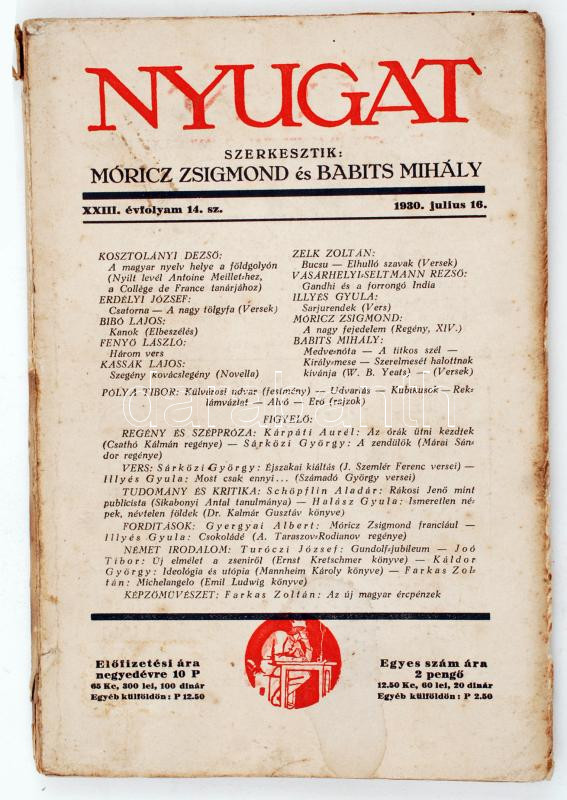 1930 A Nyugat című folyóirat XXIII. évfolyamának 14. száma, benne Kosz... https://www.darabanth.com/de/234-Fernauktion/234.0/Andere-Sammelgebiete/Drucksachen~40003/1930-A-Nyugat-cimu-folyoirat-XXIII-evfolyamanak-14-szama-benne-Kosztolanyi-Dezso-Kassak~II1048035