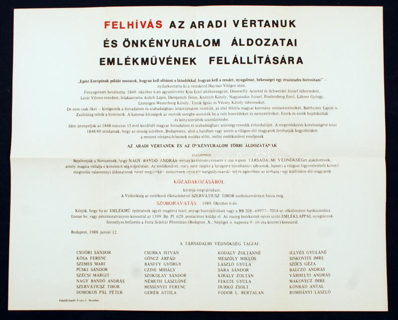 Beschreibung: 1988 Felhívás az Aradi Vértanúk és önkényuralom áldozatai emlékművének felállítására, hajtogatva, 40x49cm625