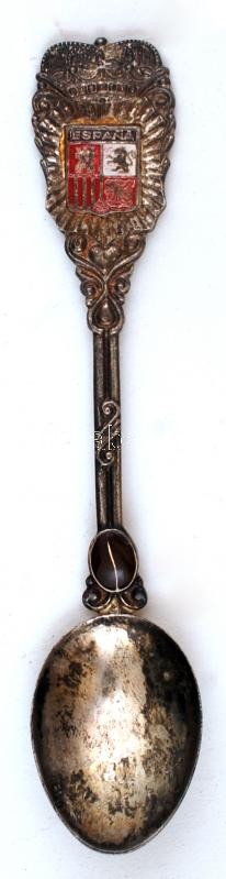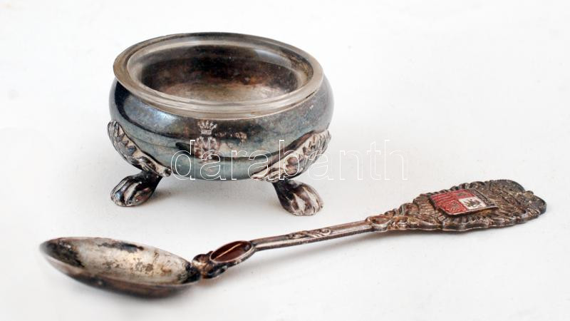 Beschreibung: Gazdagon díszített, oroszlánlábas, monogrammal ellátott, üvegbetétes alpakka fűszertartó + "España" feliratú, díszes nyelű, szintetikus kő berakásos kiskanál