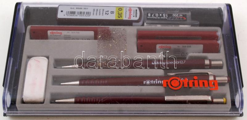Beschreibung: Rotring töltőceruza-készlet, 3 db toll, különböző vastagságú hegyekkel, radírral, saját dobozában