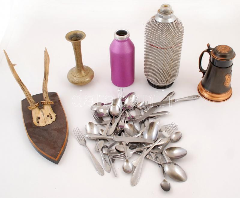 Vegyes bolha tétel: fémhálós, gumi talapzatú szódásüveg fej nélkül, gazdagon díszített réz váza, agancs, fém-üveg korsó, fém evőeszközök (kések, villák, kanalak, kiskanalak), stb.