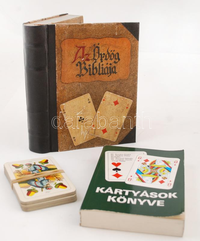 Vegyes kártya tétel: Platnik Francia kártya teljes, 2 csomag "Az ördög bibliája" feliratú dobozban, 1 csomag Magyar kártya, Kártyások könyve, Bp., 1984, Sport