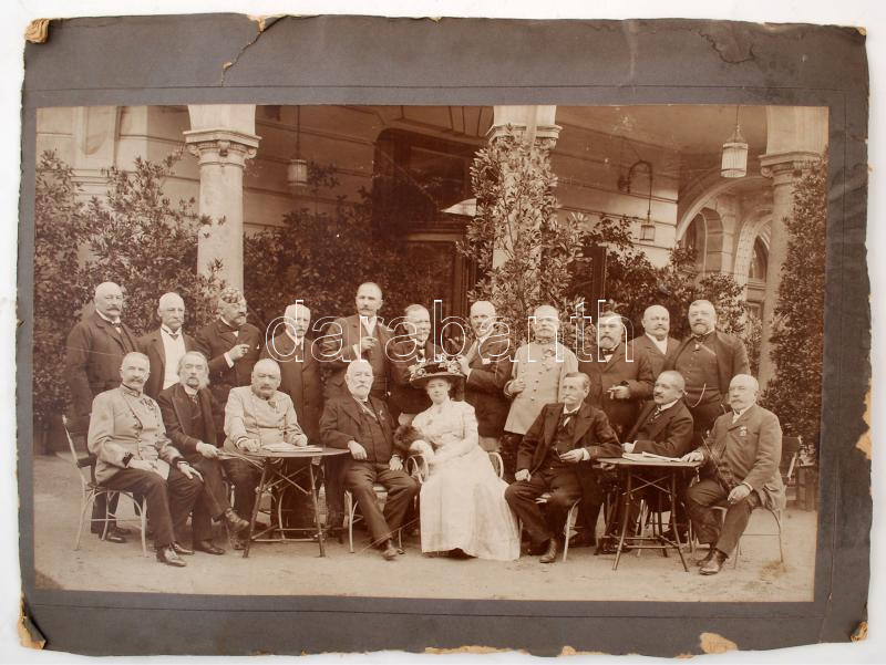 1909 Strelisky csoportképe valamely főrendű, főrangú társaságról egy kastély parkjában, a vendégek között három főtiszt, számos kitüntetéssel, hidegpecséttel jelzett, 23x36 cm, karton (sérült, vágott) 30x40 cm