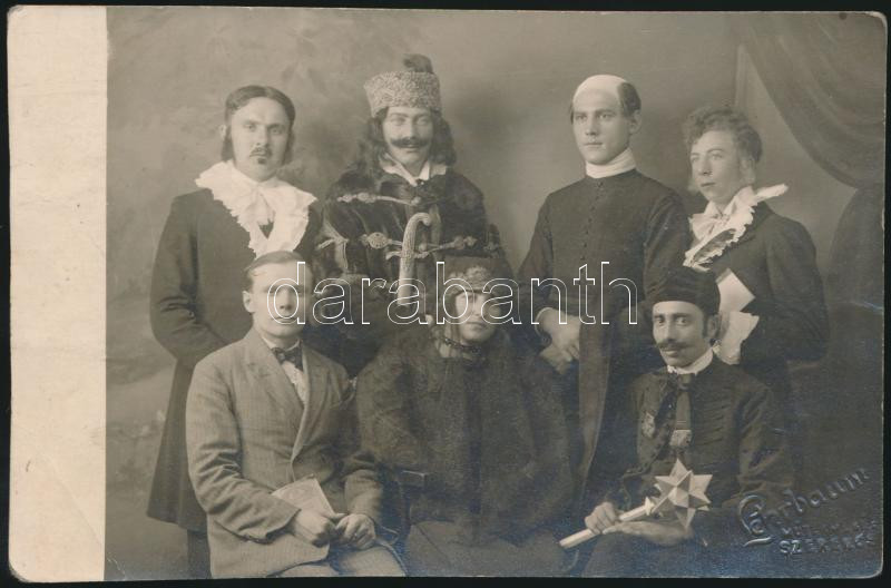 1926. március 27. Lehrbaum (Szerencs): Színészek csoportképe, felirat szerint: Történik II. Rákóczi Ferenc várkastélyában Szerencsen, mely jelenleg Szirmay gróf tulajdona. Ebben a kastélyban gyilkolták meg Rákóczi Zsigmondot, mikor menekül Vöröspatakról, fotólap, 9x14 cm