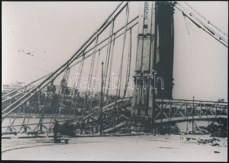 1945 Romos Budapest a háború után, a németek által felrobbantott Erzsébet híd maradványa, Dr. Kunszt János (1892–1960) jelzetlen felvétele, későbbi nagyítás, 16x23 cm