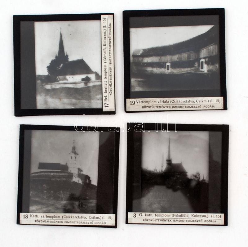 cca 1920 Erdély, az Uránia Szemléltető Taneszközök Gyára által készített felvételek erdélyi kerített vártemplomokról (Felsőfüld, Körösfő, Csíkkarcfalva), 4 db vetíthető üveglemez diapozitív kép feliratozva, 8x8 cm