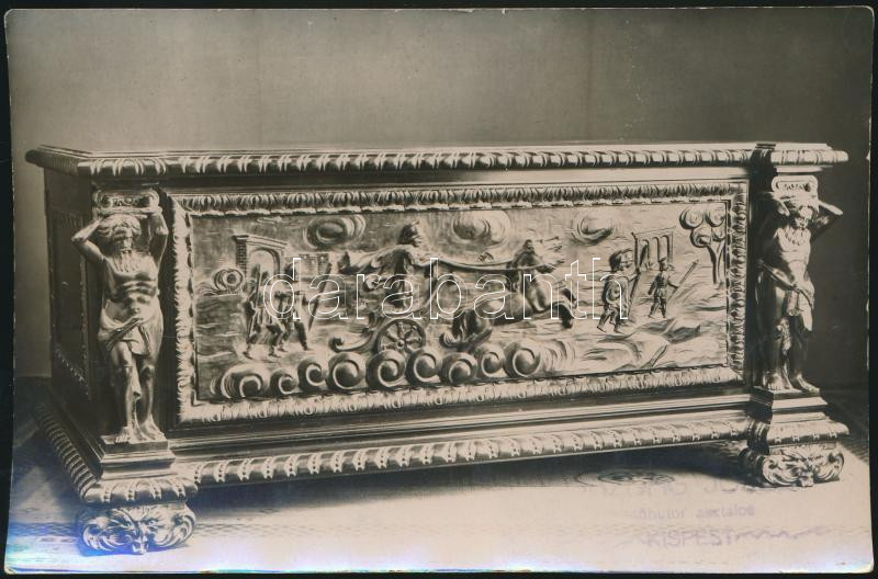 Beschreibung: cca 1920 Kispest, Gazdag József műbútor asztalos egyik remeke, faragott láda római kori jelenettel, reklámfotó a mester pecsétjével, 11x17 cm