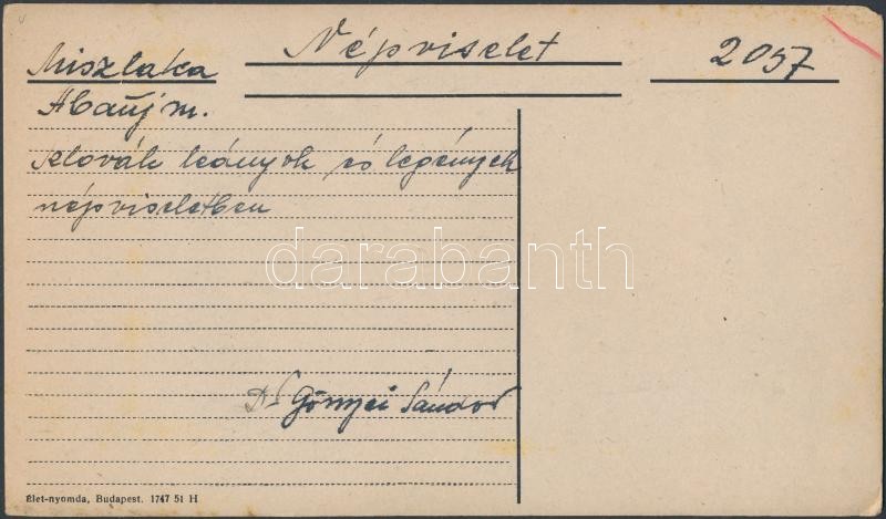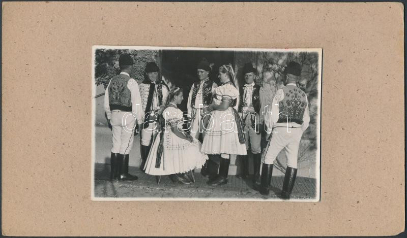 cca 1920 Miszlóka (ma: Myslava, Kassa városrésze, Szlovákia), szlovák leányok és legények népviseletben, kartonra ragasztott fotó, Gönyei Sándor (1886-1963) néprajzkutató felvétele, hátulján feliratozva, 8×12 cm
