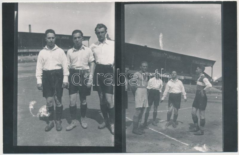 Beschreibung: cca 1930 Bíró sporttársak a labdarugó mérkőzés kezdetén, ismeretlen szerző két felvételének későbbi kontakt másolata, 9x14 cm
