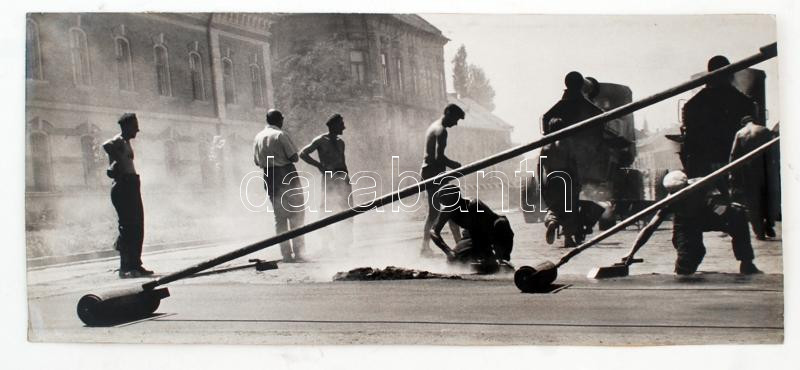 Beschreibung: cca 1960 Dr. Kosztolányi Gyula (Szeged): Aszfaltozók, feliratozott vintage fotóművészeti alkotás, 17x40 cm