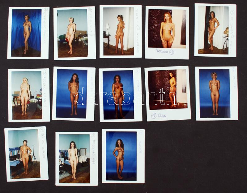 Beschreibung: cca 1980 Fotómodell válogatásra jelentkezett lányok első polaroid felvételei, akt fotók, 13 db kép, 11x8 cm /