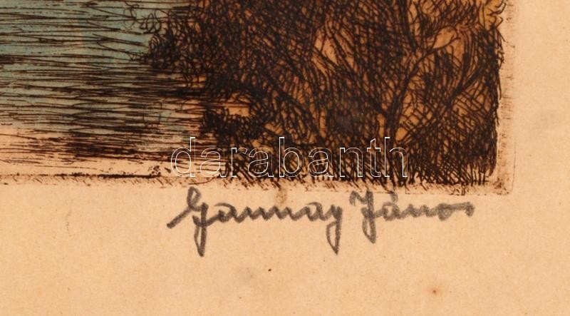 Beschreibung: Gannay János (1905-1992): Mosónők. Színezett rézkarc, papír, jelzett, üvegezett keretben, 27×36 cm