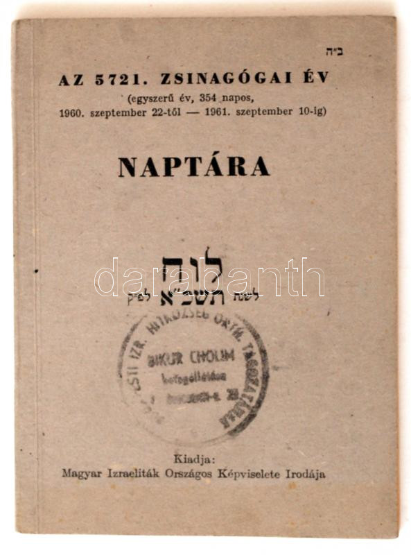 Beschreibung: Az 5721. Zsinagógai év (egyszerű év, 354 napos 1960 szeptember 22-től- 1961 szeptember 10-ig) naptára. Kiadja: Magyar Izraeliták Országos Képviselete Irodája.