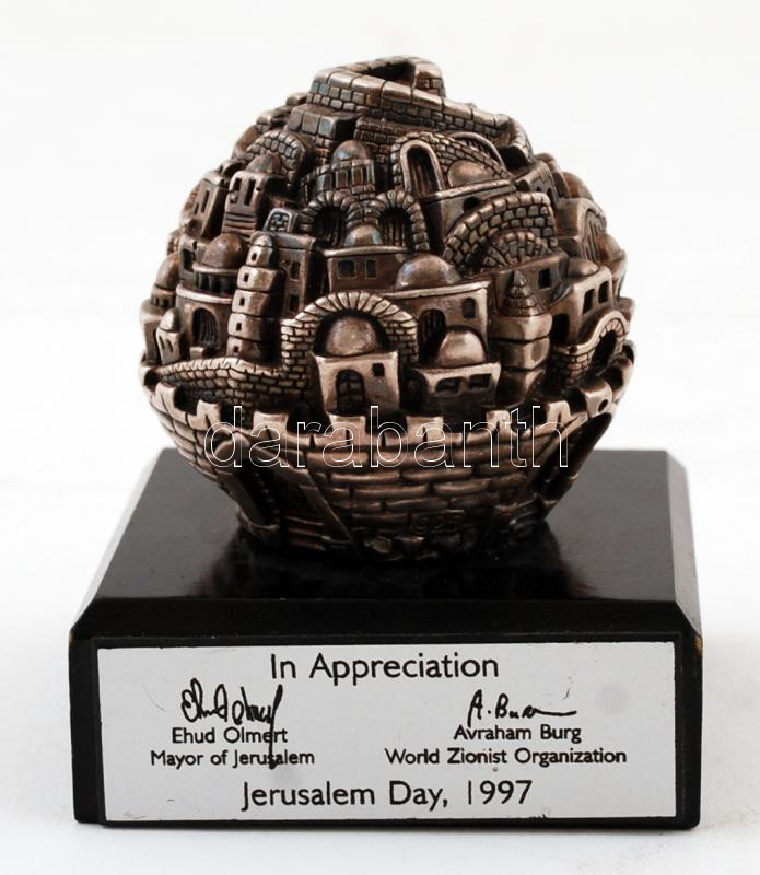 Ezüst (Ag.) levélnehezék, Jeruzsálem képével, jelzett (tervezője: Sam Philpie), festett fa talapzattal, tanúsítvánnyal, bruttó: 332 g, m:6 cm, d:6 cm / Judaica Jerusalem day Sculpture,1997 Sam Philipe Paperweight 925 Sterling