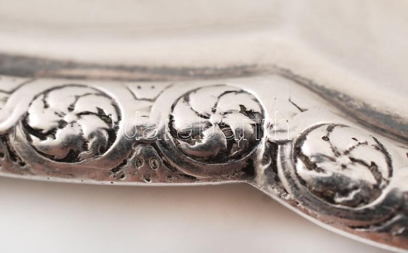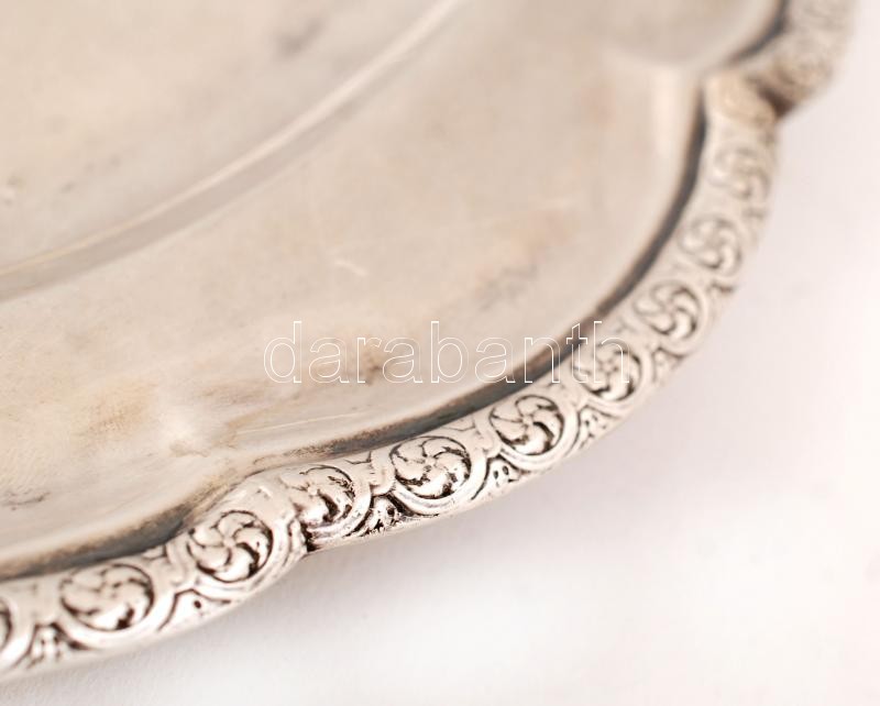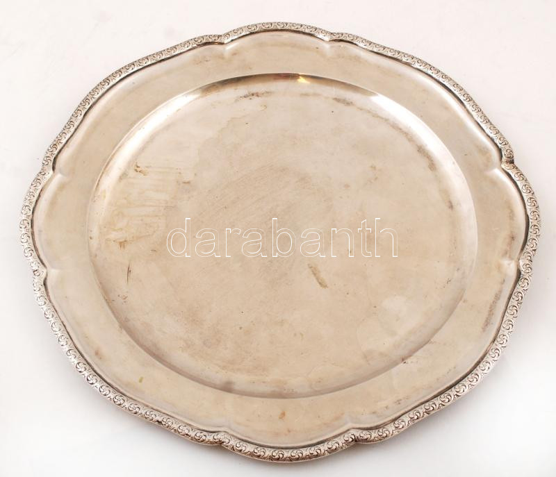 Ezüst (Ag.) tálca, jelzett, karcolt, perem díszítés fém, bruttó:776 g,... https://www.darabanth.com/de/234-Fernauktion/234.0/Andere-Sammelgebiete/Juwelen~40161/Ezust-Ag-talca-jelzett-karcolt-perem-diszites-fem-brutto776-g-d33-cm~II1071681