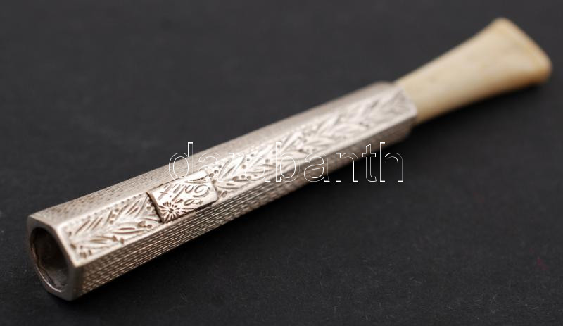 Beschreibung: cca 1900 Gazdagon díszített, jelzés nélküli ezüst női szipka, Edit felirattal, h:9cm