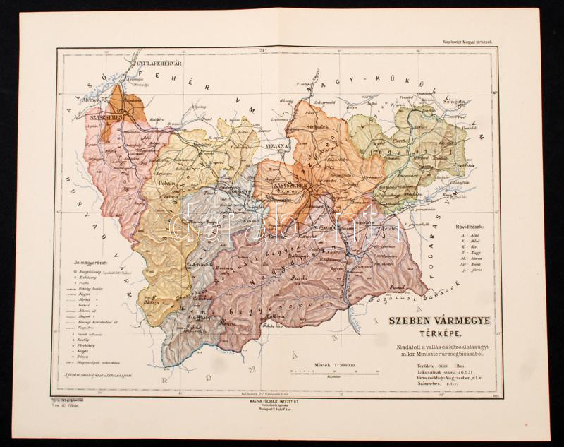1912 Szeben Vármegye térképe. 1:360 000, Kiadatott a vallás és közoktatásügyi m. kir. Miniszter úr megbízásából. Magyar Földrajzi Intézet. Szép állapotban. 26x34cm