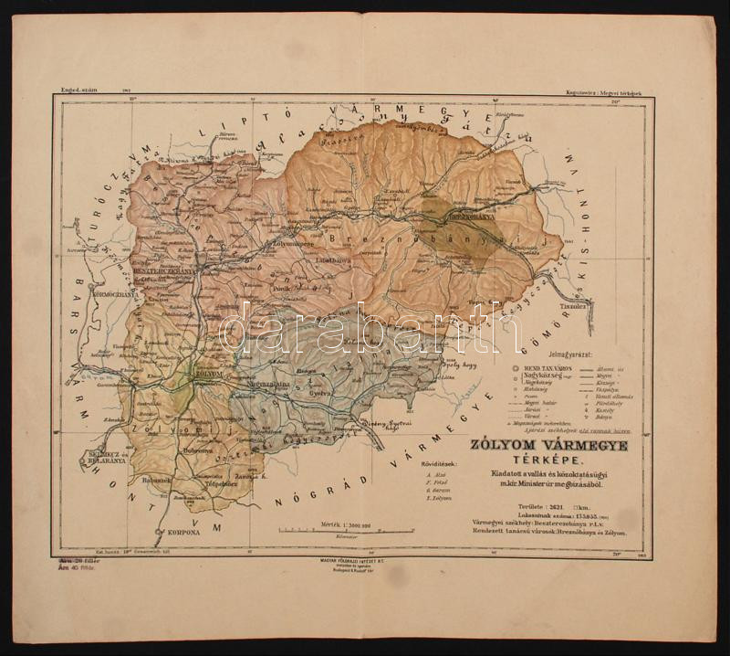 1912 Zólyom Vármegye térképe. 1:300 000, Kiadatott a vallás és közoktatásügyi m. kir. Miniszter úr megbízásából. Magyar Földrajzi Intézet.Szép állapotban. 33x34cm