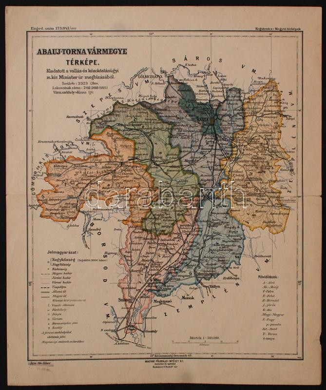 1913 Abauj-Torna Vármegye térképe. 1:380 000, Kiadatott a vallás és közoktatásügyi m. kir. Miniszter úr megbízásából. Magyar Földrajzi Intézet. Szép állapotban. 32x25cm