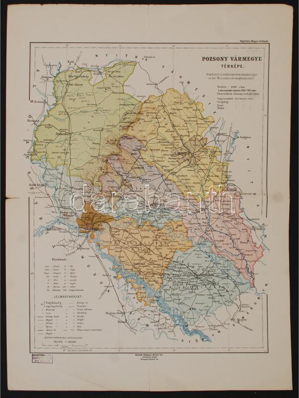 1913 Pozsony Vármegye térképe. 1:300 000, Kiadatott a vallás és közoktatásügyi m. kir. Miniszter úr megbízásából. Magyar Földrajzi Intézet. Hajtás mentén szakadozott. 44x32cm