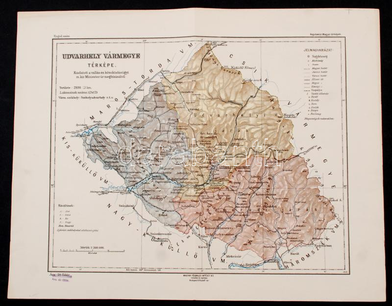 1913 Udvarhely Vármegye térképe. 1:300 000, Kiadatott a vallás és közoktatásügyi m. kir. Miniszter úr megbízásából. Magyar Földrajzi Intézet. Szép állapotban. 30x38cm