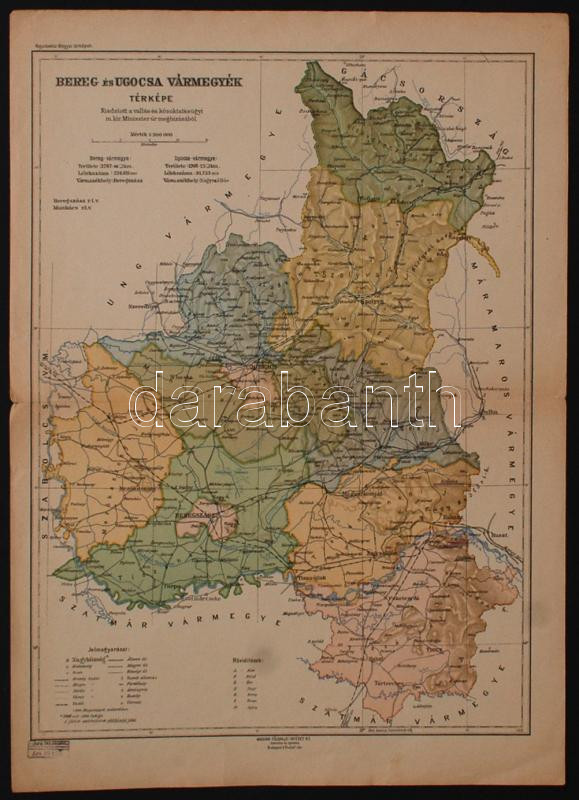1915 Bereg és Ugocsa Vármegye térképe. 1:300 000, Kiadatott a vallás és közoktatásügyi m. kir. Miniszter úr megbízásából. Magyar Földrajzi Intézet. 44x32cm