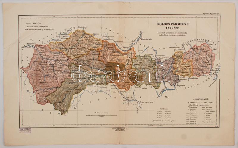 cca 1913 Kolozs Vármegye térképe. Kiadatott a vallás és közoktatásügyi m. kir. Miniszter úr megbízásából. Magyar Földrajzi Intézet. Kissé viseltes állapotban. 28x46cm