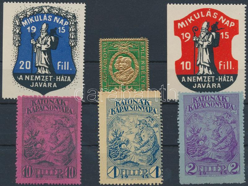 Beschreibung: 1915 I. Világháború emlékbélyeg arany dombornyomással + 5 klf segélybélyeg
