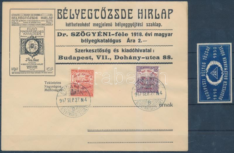1917 Bélyegtőzsde Hírlap boríték 2 db bélyeggel + 1 db Bélyegtőzsde le... https://www.darabanth.com/de/234-Fernauktion/234.0/Andere-Sammelgebiete/Paraphilatelie~40030/1917-Belyegtozsde-Hirlap-boritek-2-db-belyeggel-plus-1-db-Belyegtozsde-levelzaro~II1066408