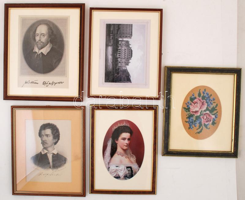 Beschreibung: Vegyes képkeret tétel, üvegezett, vegyes méretben, nyomattal, ill., gobelinnel, szép állapotúak, 5db