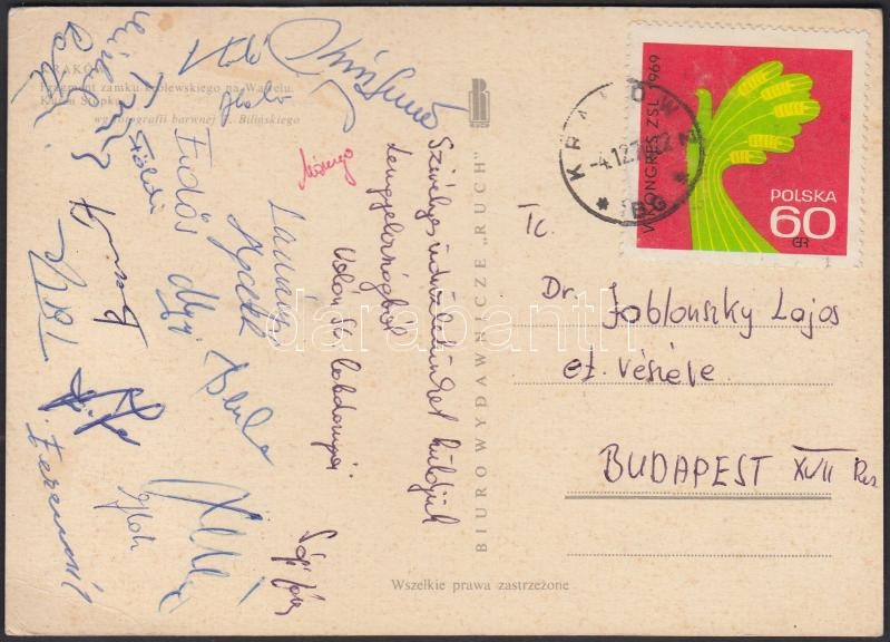 Beschreibung: 1970 a Volán SC labdarúgóinak üdvözlő sorai és aláírásai Krakkóból küldött levelezőlapon