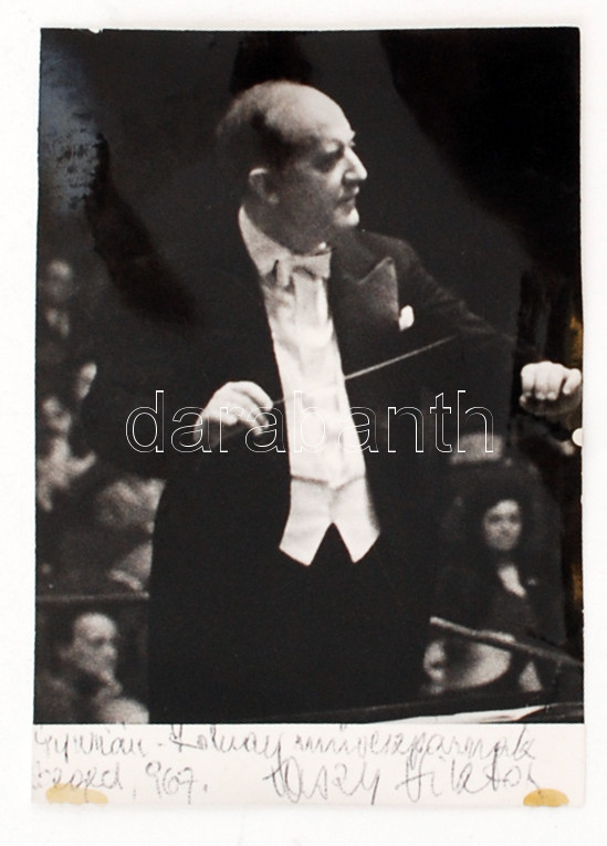Vaszy Viktor (1903-1979) zeneszerző, karmester, színházigazgató, zenepedagógus aláírása és dedikálása (a Gyurián-Zolnay művészpárnak) a róla készült fotón, 11x8cm