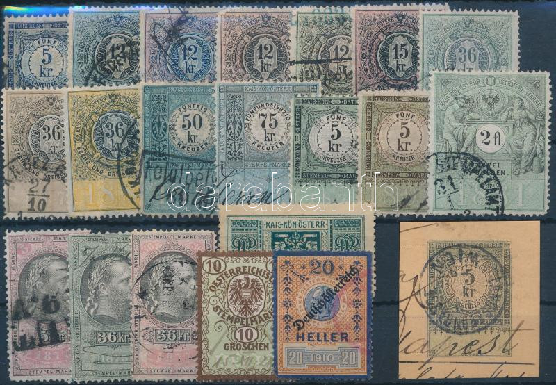 Ausztria 20 db régi okmánybélyeg + 1 díjjegyes kivágás https://www.darabanth.com/de/234-Fernauktion/234.0/Andere-Sammelgebiete/Stempelmarken~40032/Ausztria-20-db-regi-okmanybelyeg-plus-1-dijjegyes-kivagas~II1062554