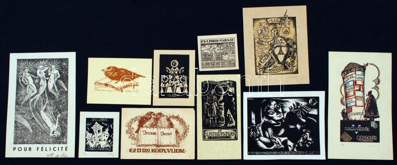 1917-1940 Ex libris gyűjtemény, fa, linó és réz metszet: Bordás, Drahos, Gáborjáni, Haranghy, Kónya, Nagy, Várkonyi, összesen 10db ebből 3db jelzett,különböző méretben