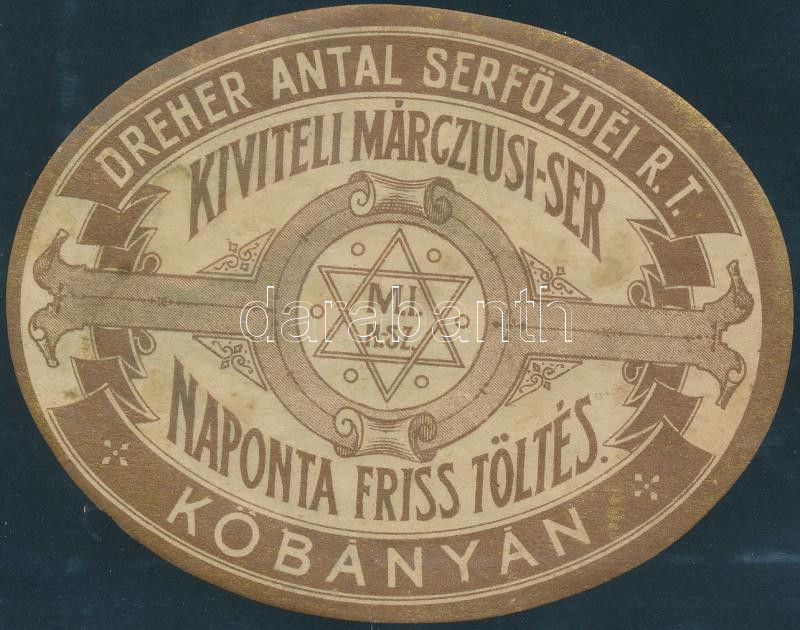 Régi sörcímke, "Dreher Antal Serfőzdéi R. T. Kőbányán" felirattal https://www.darabanth.com/de/234-Fernauktion/234.0/Andere-Sammelgebiete/Werbungen~40160/Regi-sorcimke-Dreher-Antal-Serfozdei-R-T-Kobanyan-felirattal~II1068556