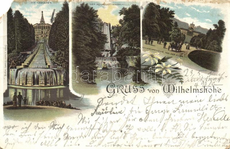 Beschreibung: 1895 Kassel, Bergpark Wilhelmshöhe, Hercules monument, waterfall, floral, litho (EM)