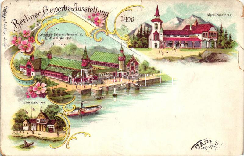 1896 Berlin, Gewerbeausstellungen, Spreewaldhaus, Nahrungs, Genussmittel, Fischerei und Sport Gebaude / Industrial Exposition, Food, beverages, tobacco, fishing and recreational building, floral Art Nouveau litho (b)