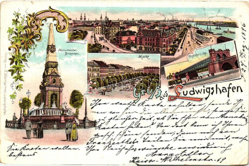 Beschreibung: 1896 Ludwigshafen, Markt, Rheinbrücken, Monumental-Brunnen / market, bridge, fountain, Art Nouveau litho (small tear)