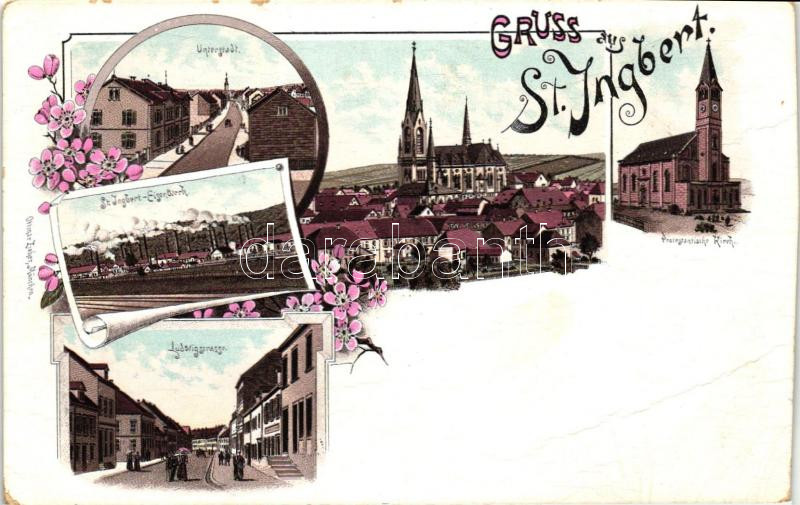 Sankt Ingbert, Unterstadt, Kirche, Eisenwerk, Ludwigstrasse, Ottmar Zieher / church, ironworks, street, floral, litho (fa)