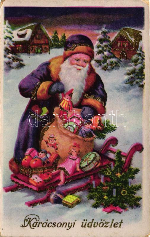 Christmas, Santa Claus, sleigh, bag of presents, golden decoration https://www.darabanth.com/de/234-Fernauktion/234.0/Ansichtskarten/GruC39Fkarte~40152/Christmas-Santa-Claus-sleigh-bag-of-presents-golden-decoration~II1016668