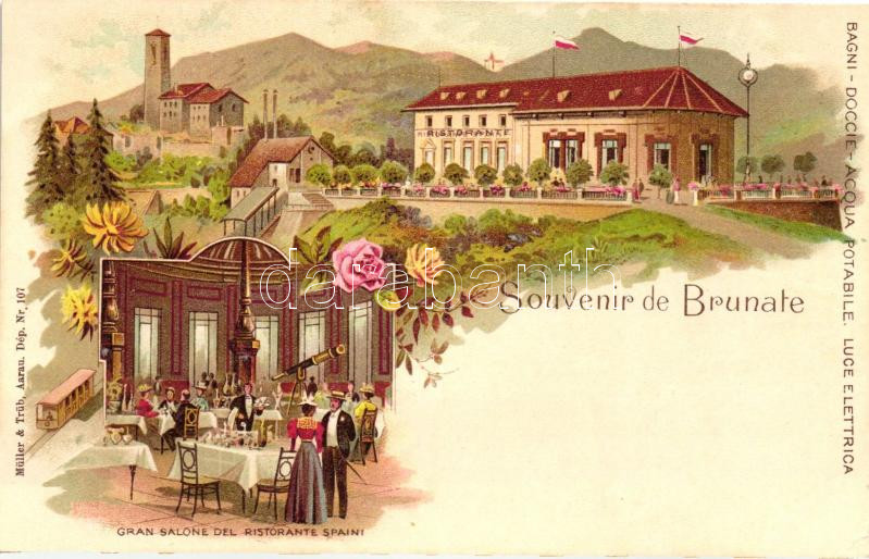 Beschreibung: Brunate, Ristorante Spaini, Gran Salone / restaurant, hall interior, funicular, Müller & Trüb Nr. 107.floral litho