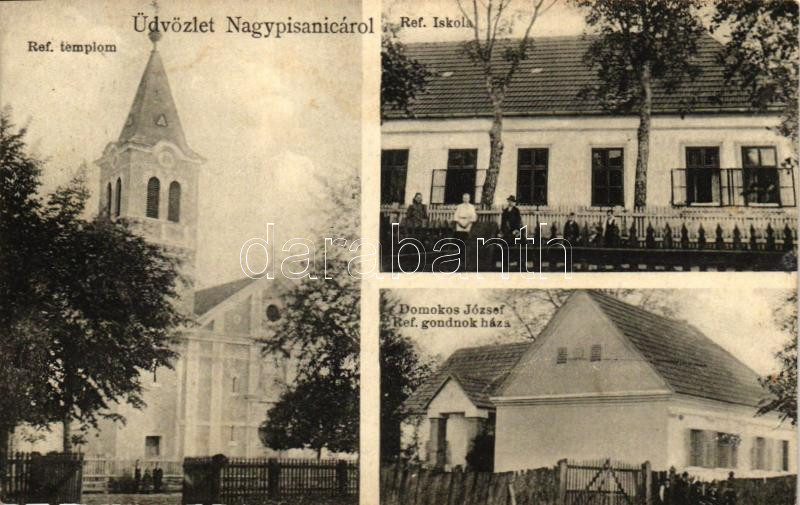 Nagypiszanica, Velika Pisanica; Református templom és iskola, Domokos József református gondnok háza / Calvinist church and school, Calvinist caretaker's house (EB)