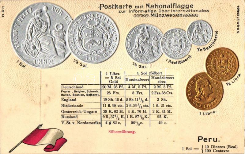 Peru - Set of coins, flag, Emb. litho (wet damage) https://www.darabanth.com/de/234-Fernauktion/234.0/Ansichtskarten/Numismatik~40134/Peru--Set-of-coins-flag-Emb-litho-wet-damage~II1065035