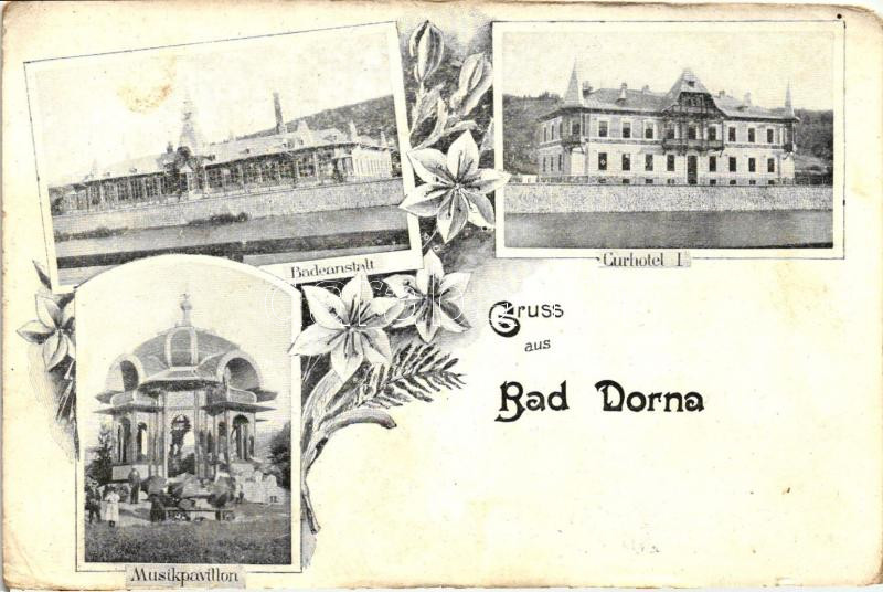 Dornavátra, Bad Dorna; curhotel, music pavilion, spa, floral (EK) https://www.darabanth.com/de/234-Fernauktion/234.0/Ansichtskarten/Rumanien~40100/Dornavatra-Bad-Dorna-curhotel-music-pavilion-spa-floral-EK~II1065531