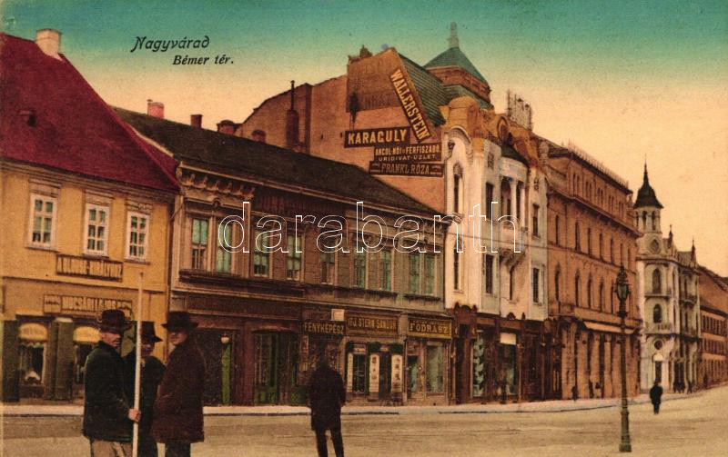 Nagyvárad, Bémer tér, Mocsári Lajos üzlete, fényképész, Ifj. Stern Sándor üzlete, Lévay István fodrász, Frankl Róza hímző és varró terem hirdetése, Wallerstein és Karaguly hirdetés / shops, photographer, hairdresser, advertisement