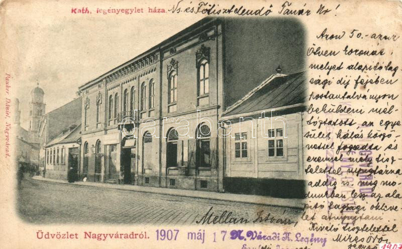Nagyvárad, Katolikus legényegylet háza / Catholic Lad Association (EK) https://www.darabanth.com/de/234-Fernauktion/234.0/Ansichtskarten/Siebenburgen~6/Nagyvarad-Katolikus-legenyegylet-haza-Catholic-Lad-Association-EK~II1064079