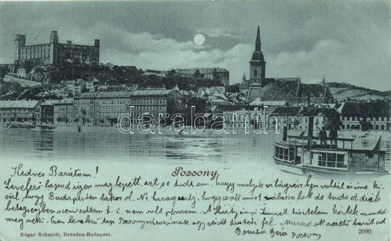 Beschreibung: 1899 Pozsony at night, castle, church, ship