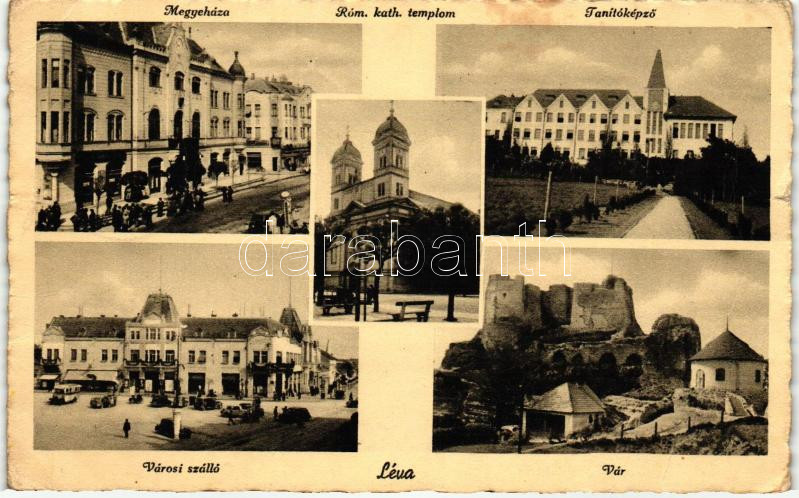 Léva, Megyeháza, Római katolikus templom, Tanítóképző, Városi szálló, vár / county hall, Roman catholic church, teacher training, hotel, castle (fa)