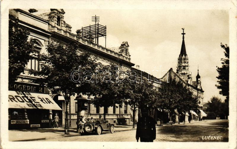 Beschreibung: Losonc, Lucenec; Fő utca, Bokor Drogéria, felújítás alatt álló református templom / main street, drugstore, church under construction